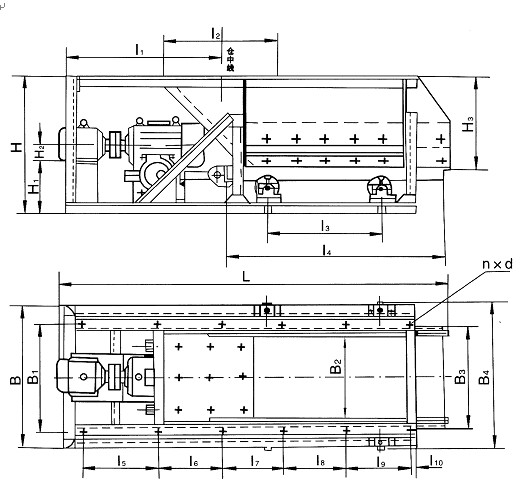 槽式給料機可以架設于地面,也可以吊裝在礦倉卸料口上。槽底板作往復運動,其沖次為 20-60 次/min, 沖程為20-200mm。沖程可由驅動裝置偏心輪進行適當調整,偏心距為沖程之半。