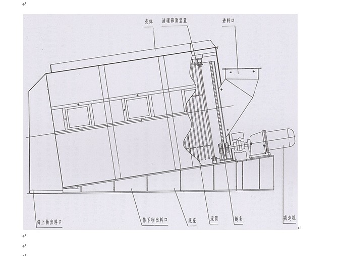 滾筒篩結構是由殼體、篩筒、篩筒支架、減速機、減速機座幾部分組成。機械傳動由電動機經(jīng)減速機后,傳給齒輪,通過齒輪傳動使篩筒旋轉。