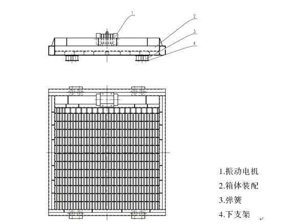 振動篦板由振動體、振動電機、支撐彈簧、彈簧支座等組成。篦板為焊接結(jié)構(gòu),篦孔尺寸根據(jù)物料種類和用戶要求而定。