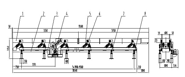 1.輸送槽;    2.平衡架;    3.底架;    4.偏心連桿驅動裝置;  5.共振彈簧;   6.彈性擺桿裝置;    7.減振彈簧;    8.減振座