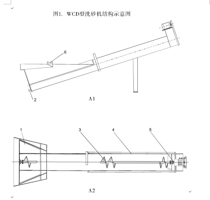 螺旋洗砂機是在傾斜布置的水槽下部形成沉淀池,螺旋頭部沒入沉淀池內,螺旋由電動機經減速機減速驅動螺旋旋轉,由沉淀池底部給入洗水,從而完成清潔,脫水和分級三種功能。